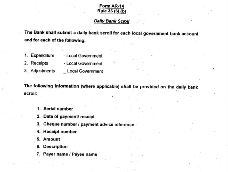 (g) all receipts of the local government shall be collected through the bank but, in rare cases and if so resolved by the House, the receipts may be collected in cash in the manner prescribed under intimation to LG&CD Department;